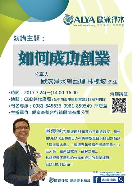 想知道創業成功的秘密嗎...... 取得連結 Facebook X Pinterest 以電子郵件傳送 其他應用程式 7月 12, 2017 想要創業的人有福了 歐漾淨水大家長要來分享如何才能成功創業 想知道不為人知的創業秘笈嗎?? 想知道如何白手起家創立自己的品牌嗎?? 不藏私告訴你如何成功創業!!!! 活動時間:2017/7/24(一)14:00~16:00 活動地址:CBD時代廣場(台中市西屯區朝富路213號7樓B5) 取得連結 Facebook X Pinterest 以電子郵件傳送 其他應用程式 留言
